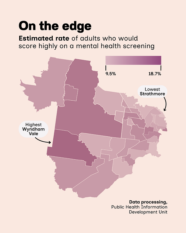 The delay cuts especially deep in places like Wyndham Vale, estimated to have the west’s highest rate of mental distress in modelling released by the Public Health Information Development Unit (PHIDU).