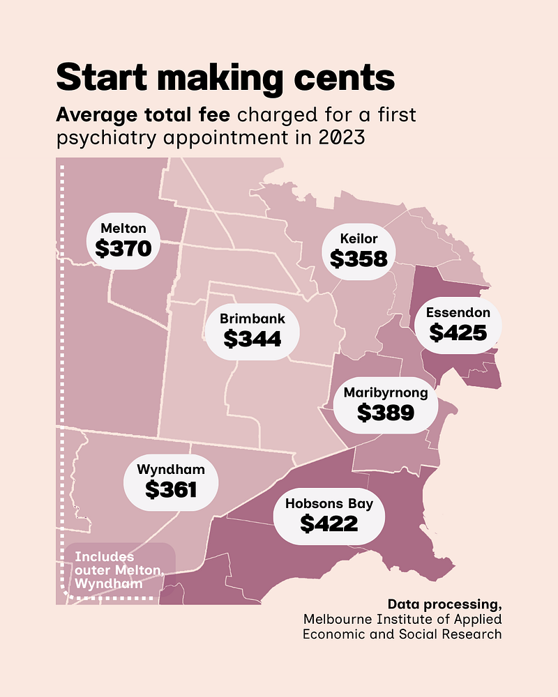 Costs for a first psychiatry appointment also varied across the west in 2023, with Brimbank enjoying the lowest average cost of $344, while the average in neighbouring Hobsons Bay climbed $78 to a total of $422.