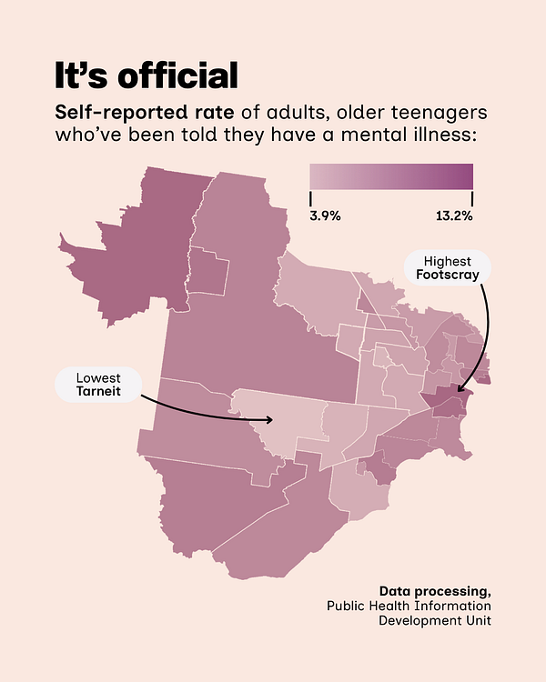 But a different approach raises concerns in Footscray, where 13.2 per cent of locals reported on the 2021 Census that a doctor or nurse said they have a mental health condition.